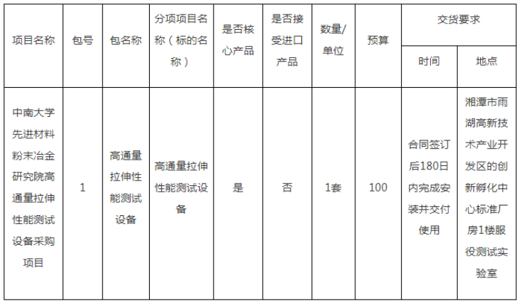 项目名称:中南大学先进材料粉末冶金研究院高通量拉伸性能测试设备采购项目
