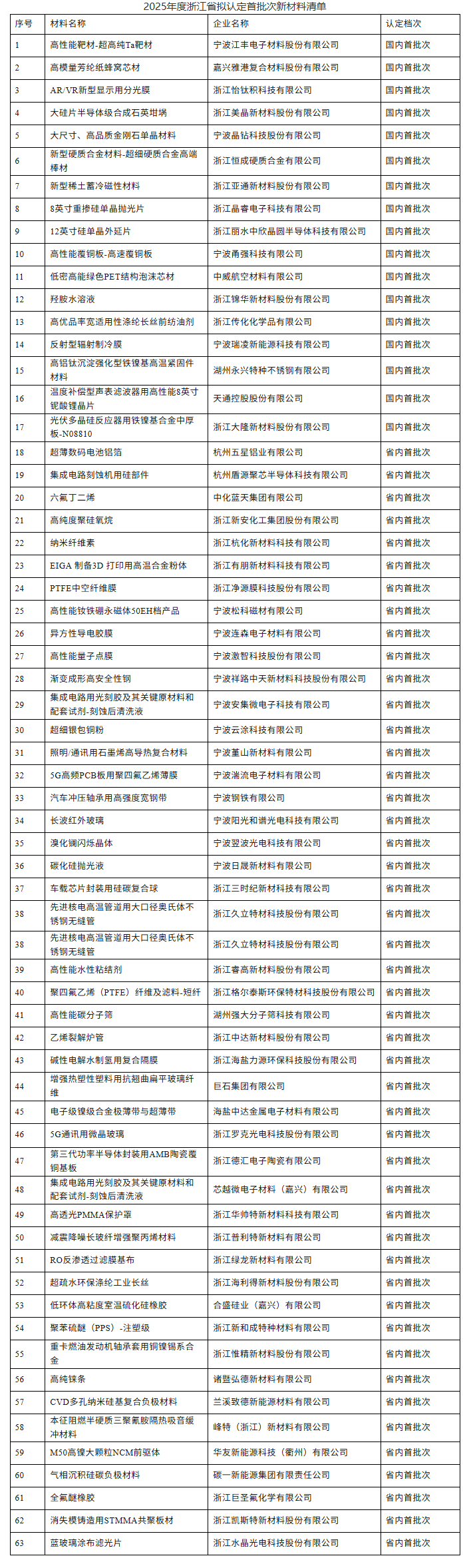 据《关于开展2025年度浙江省首批次新材料认定工作的通知》(浙经信材料便函〔2025〕85号),现将2025年度浙江省首批次新材料认定结果进行公示,请社会各界监督。