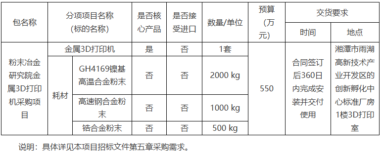 中南大学先进材料粉末冶金研究院金属3D打印机采购项目 招标项目的潜在投标人应在湖南省招标有限责任公司(长沙市雨花区湘府东路199号招标大厦1406室)获取招标文件,并于2025年11月25日 09点30分(北京时间)前递交投标文件。